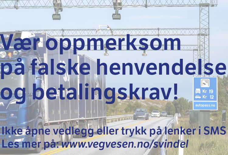 Henvendelser som utgir seg for å være bompengeinnkreving kan være svindelforsøk. Ikke åpne vedlegg eller trykk på lenker i SMS og e-post.